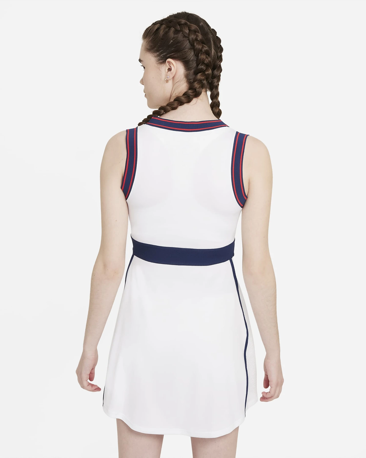 Step out of the ’80s and onto center court in the Nike Women’s Dri-FIT Slam Dress. It combines a ribbed waistband, striped trim and mesh pleats—resulting in a retro-inspired silhouette that’s ready to perform at the highest levels of play. The Nike Women’s Dri-FIT Slam Dress is made with at least 75% recycled polyester fibers.