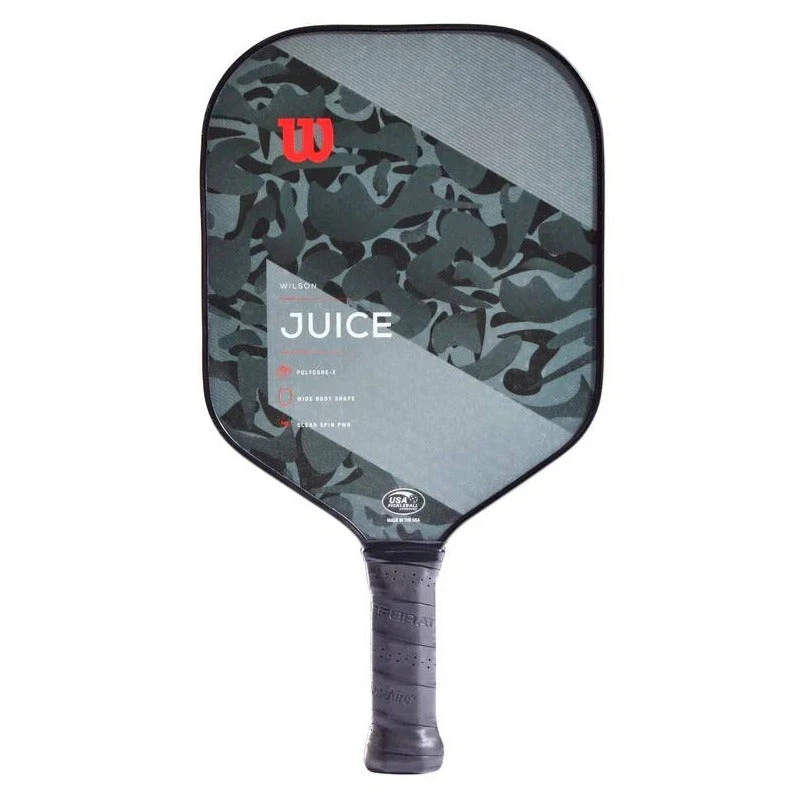 Delivering an appealing combination of clean design and sheer power, the Wilson Juice Camo paddle introduces a new wave of paddle performance to the pickleball court. The Juice features a printed spin tech on the paddle surface that increases ball rotation off the paddle surface, giving players the confidence they need to be aggressive with powerful shots when the situation warrants it. Sporting a wide body shape for a generous sweet spot and a core that impressively dampens vibrations, the USAPA-approved Juice feels great and performs even better.